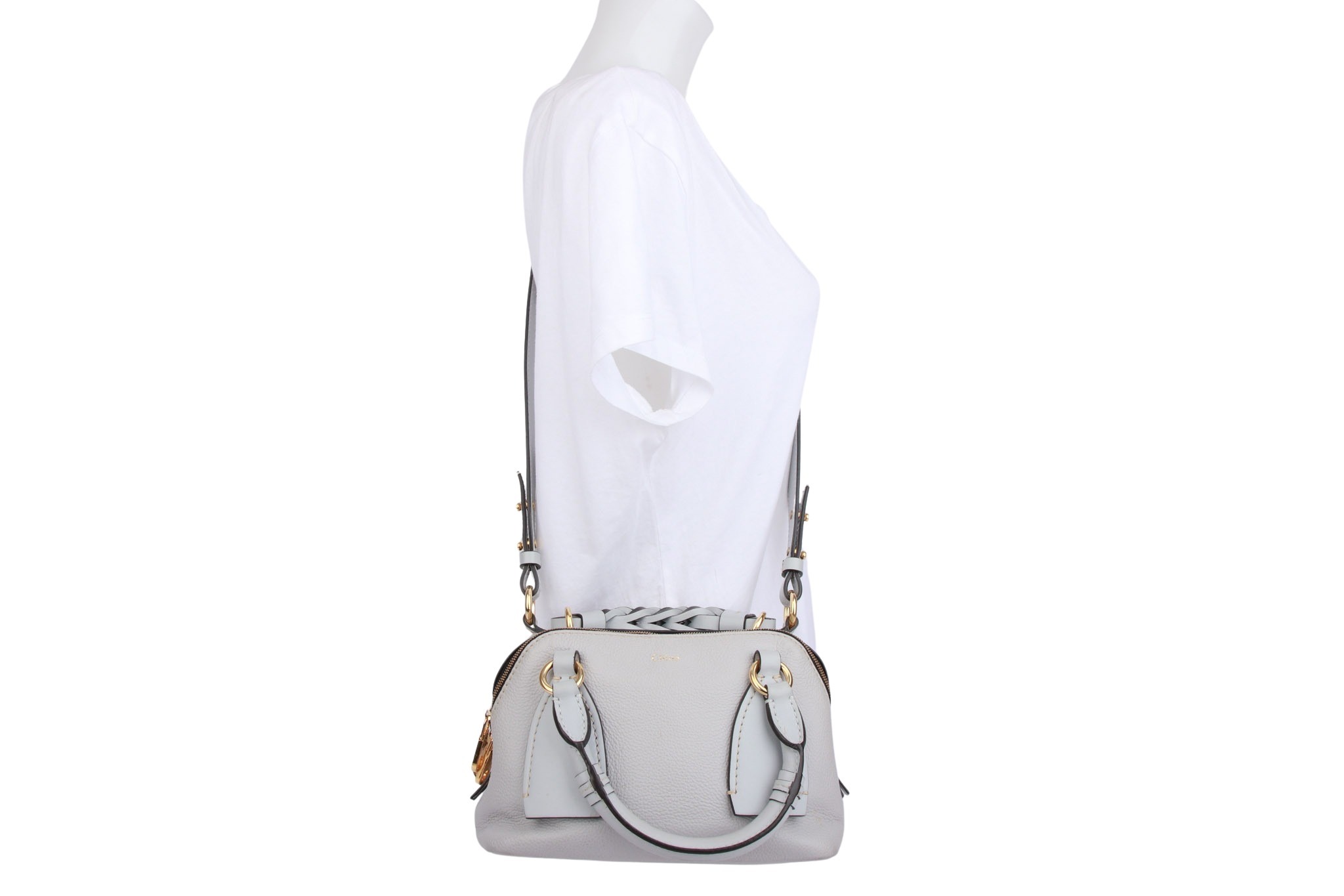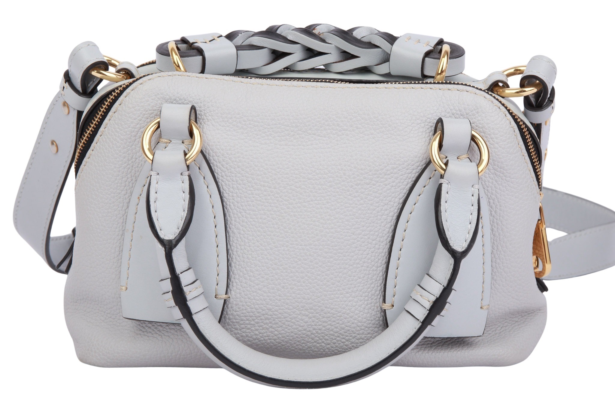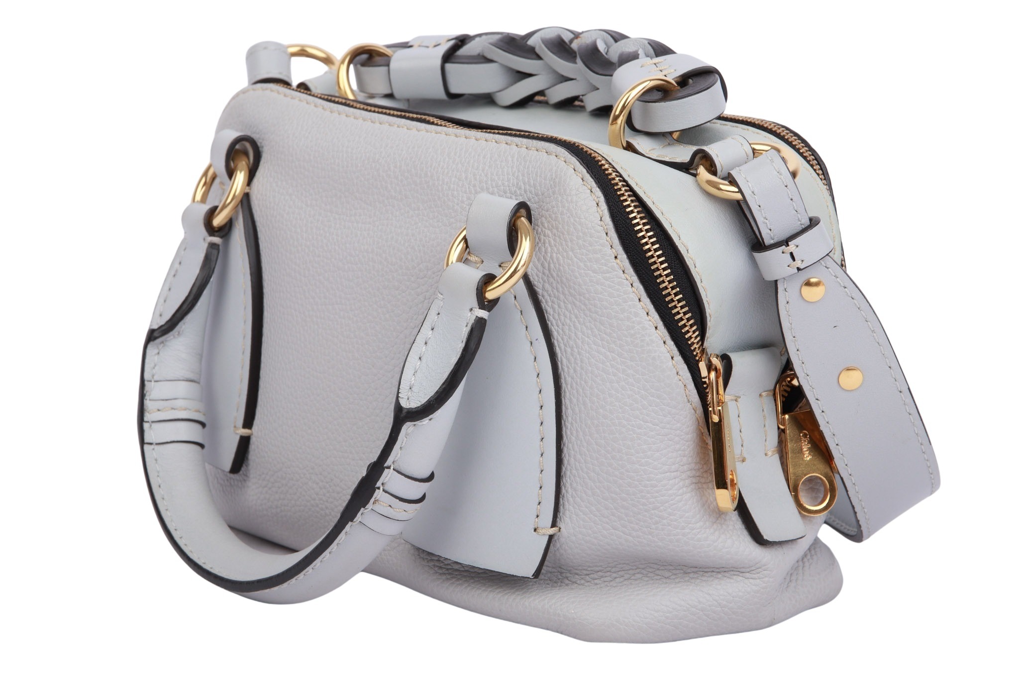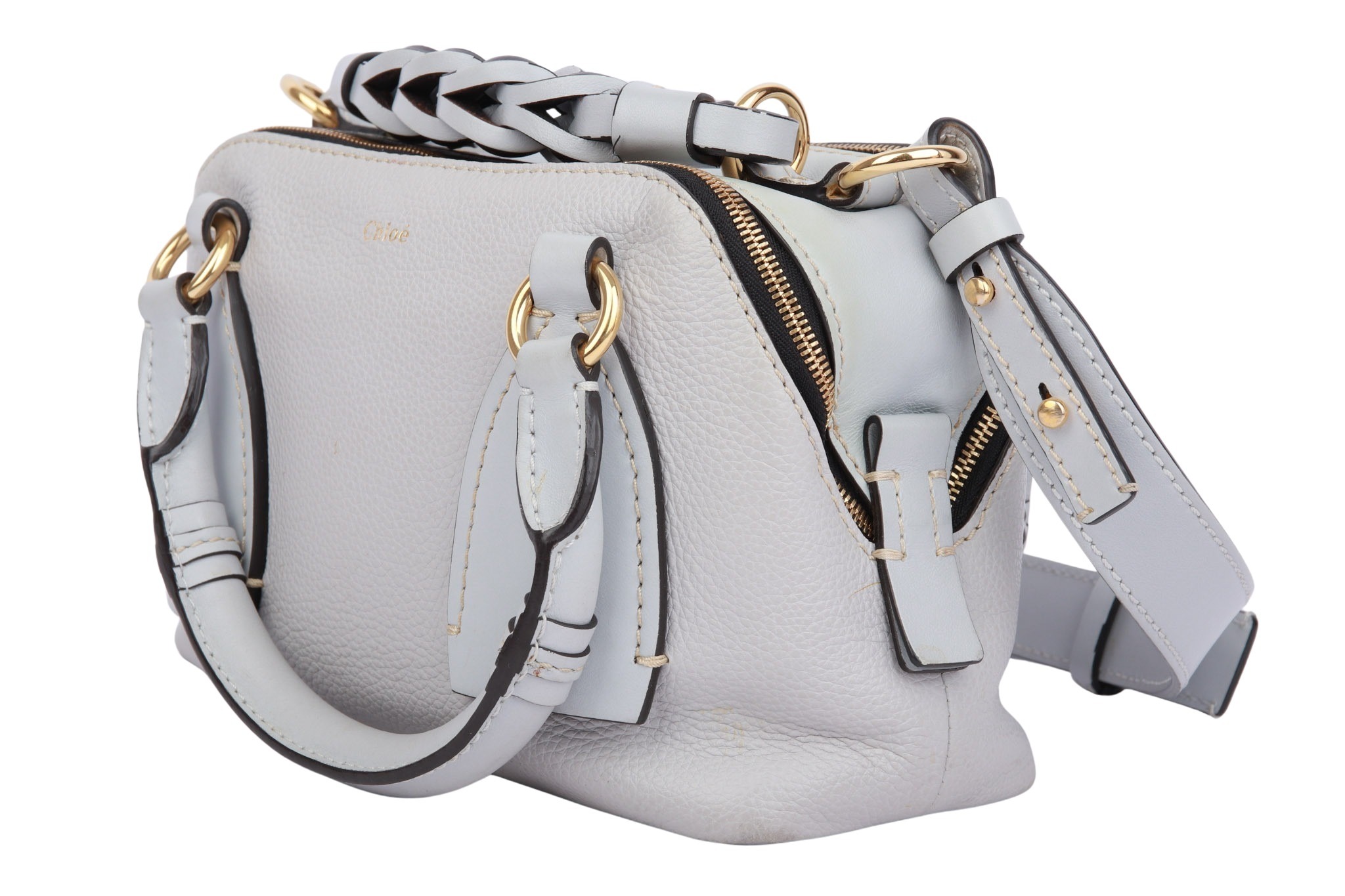 The Chloé Daria Small Bag is a stylish, compact women's leather bag in blue, crafted from high-quality calfskin with gold-tone hardware. It features two zipped main compartments, a braided leather top handle, and a detachable/adjustable shoulder strap for versatile carrying options (hand, shoulder, or crossbody). The interior is lined with fabric and offers ample space for everyday essentials.