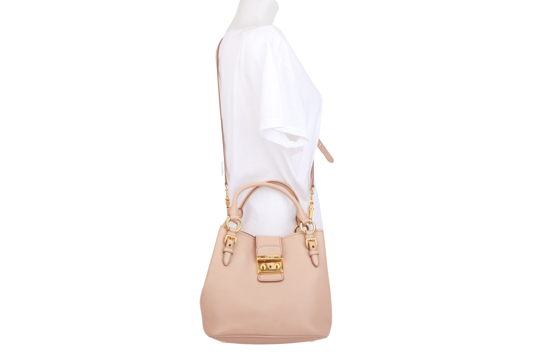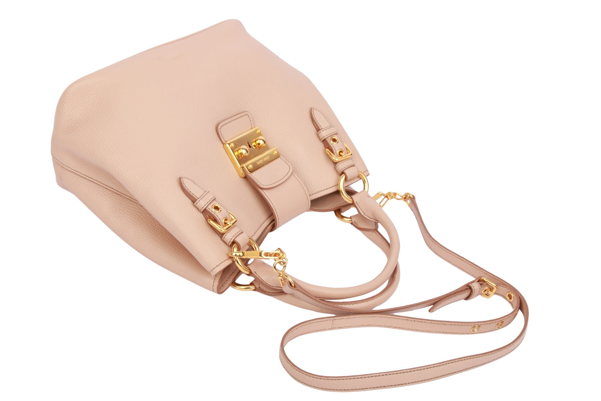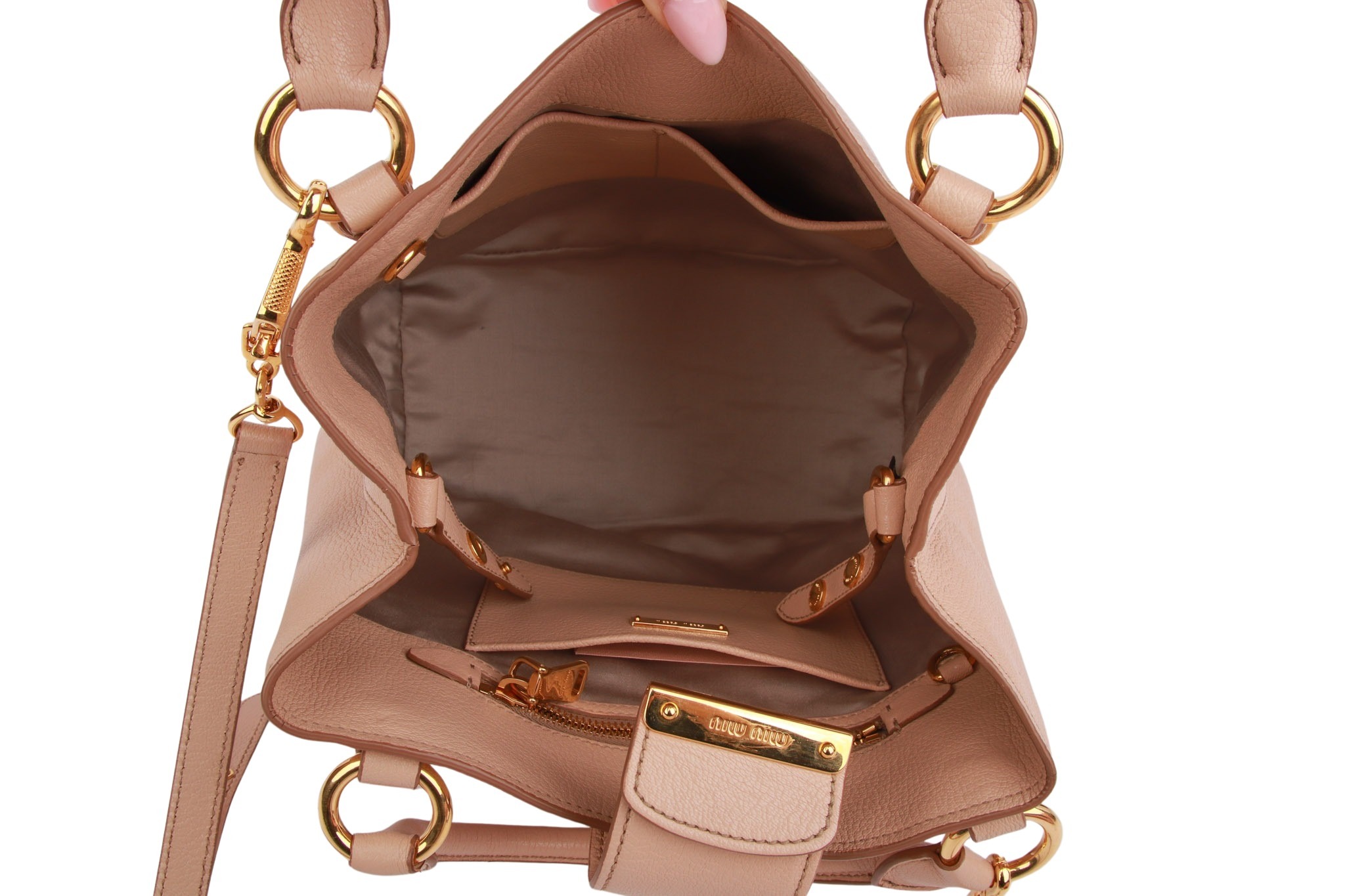 An elegant Miu Miu shoulder bag in a sophisticated nude tone, combining timeless elegance with modern design. The bag impresses with its high-quality material and the brand's signature feminine aesthetic. Its neutral color makes it versatile and the perfect companion for everyday life and special occasions.