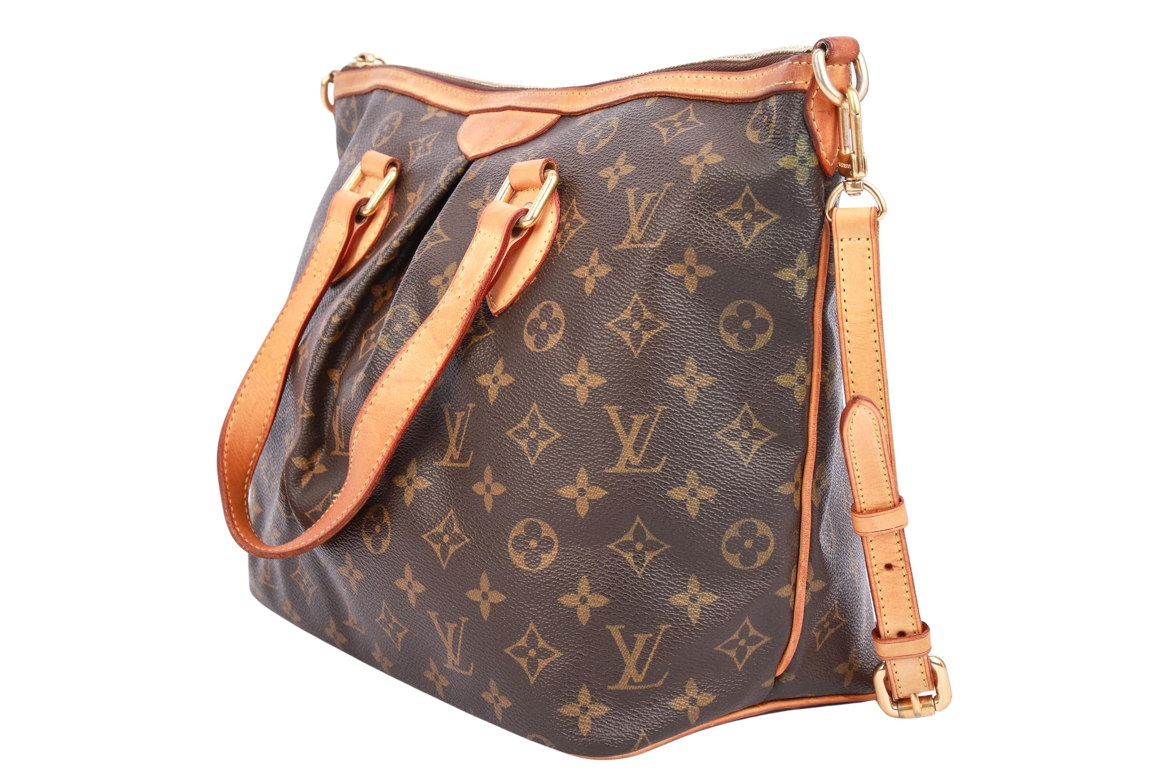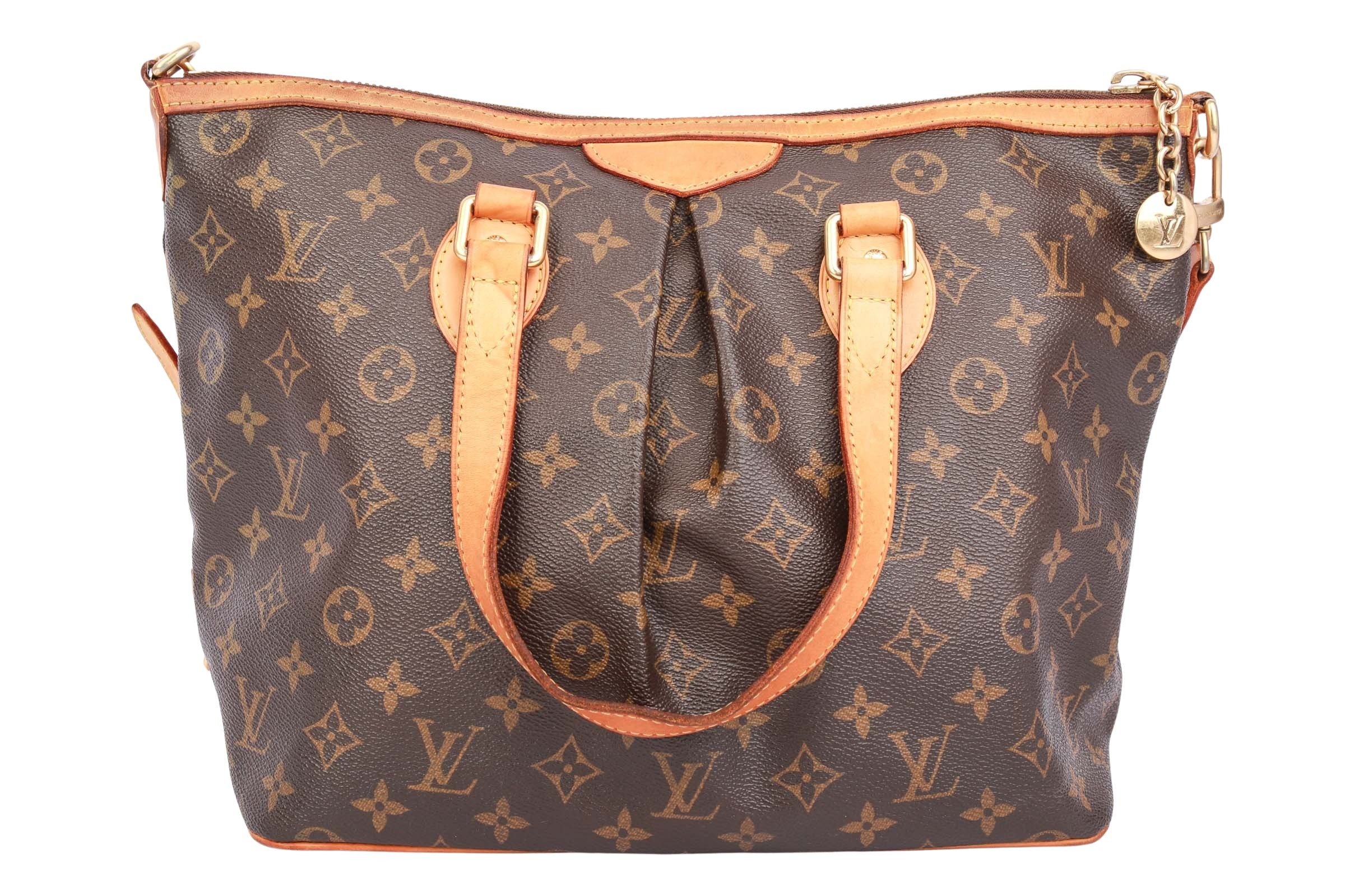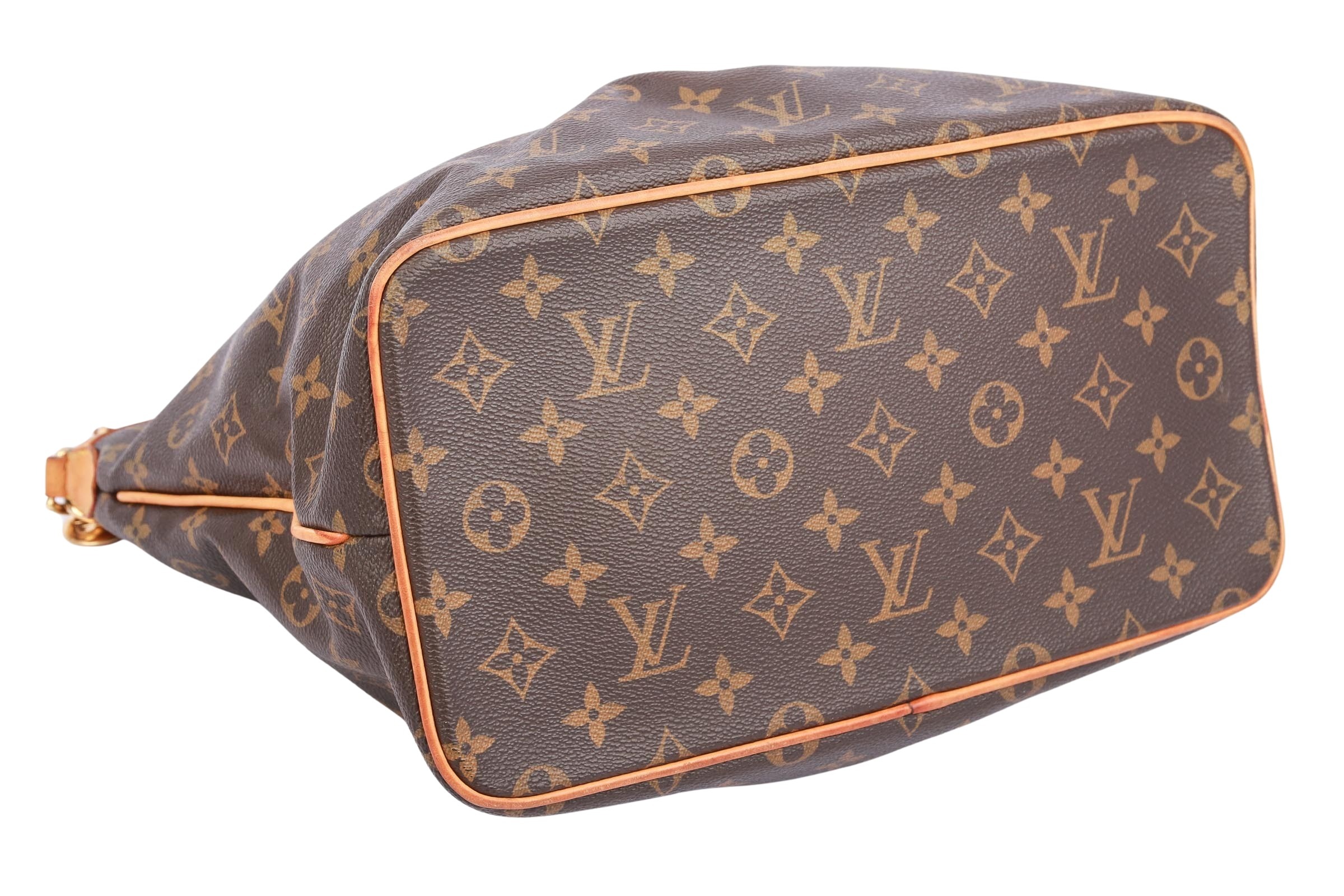 The Louis Vuitton Palermo PM is an elegant handbag crafted from Monogram canvas with natural leather trim and gold-tone hardware. It features two top handles, a detachable shoulder strap, and a zippered top closure. The interior is lined with textile and features multiple slip pockets. The bag is spacious, sturdy, and ideal for everyday use.