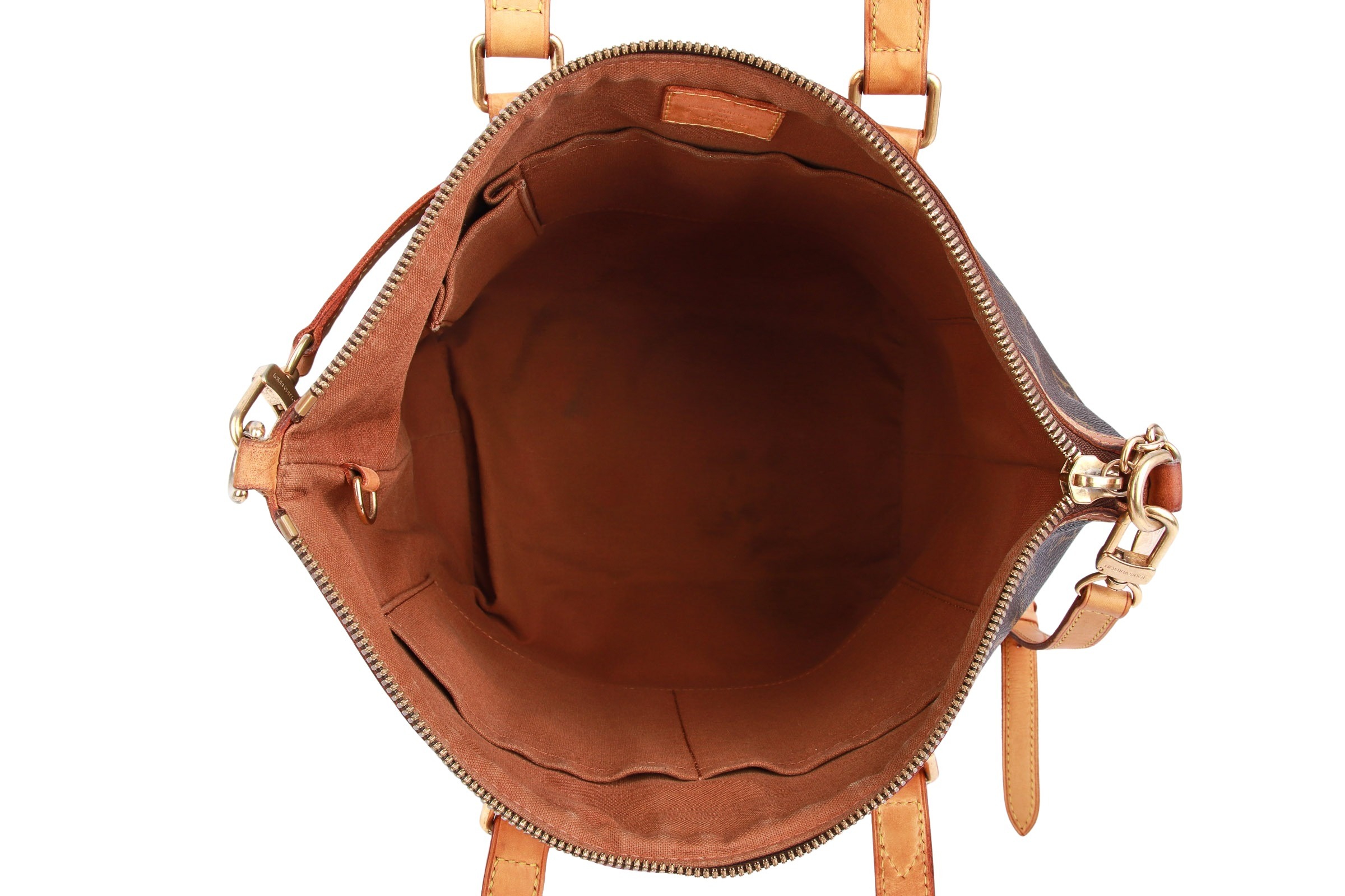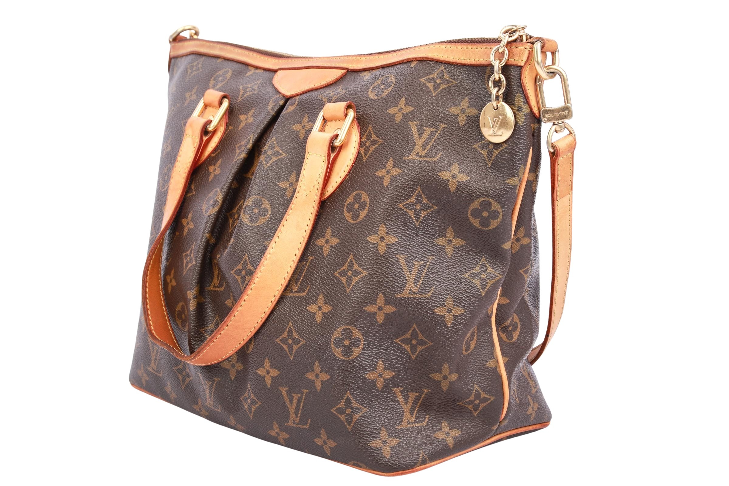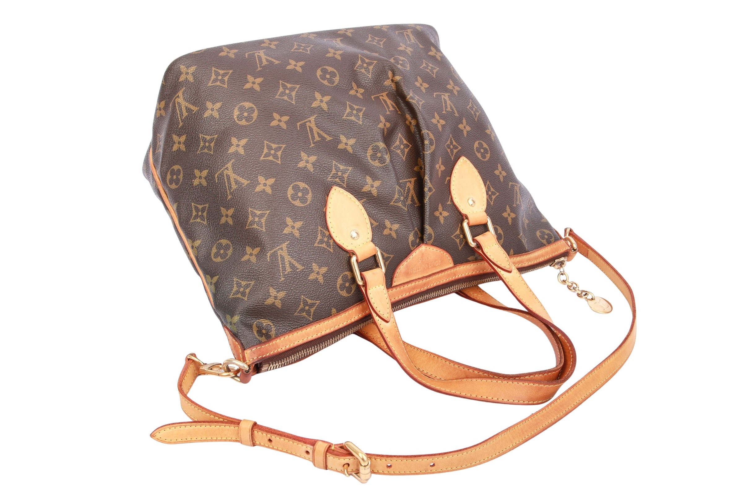 The Louis Vuitton Palermo PM is an elegant handbag crafted from Monogram canvas with natural leather trim and gold-tone hardware. It features two top handles, a detachable shoulder strap, and a zippered top closure. The interior is lined with textile and features multiple slip pockets. The bag is spacious, sturdy, and ideal for everyday use.